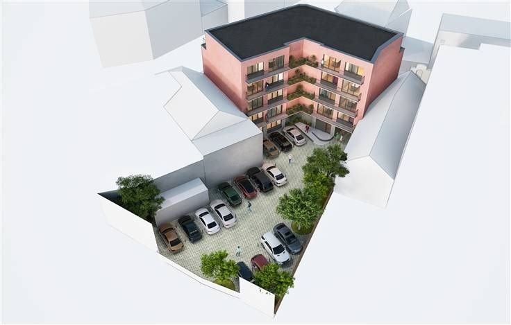 PROJECT voor de verbouwing van een kantoorgebouw tot een complex met 14 wooneenheden, 2 winkels en 15 parkeerplaatsen.