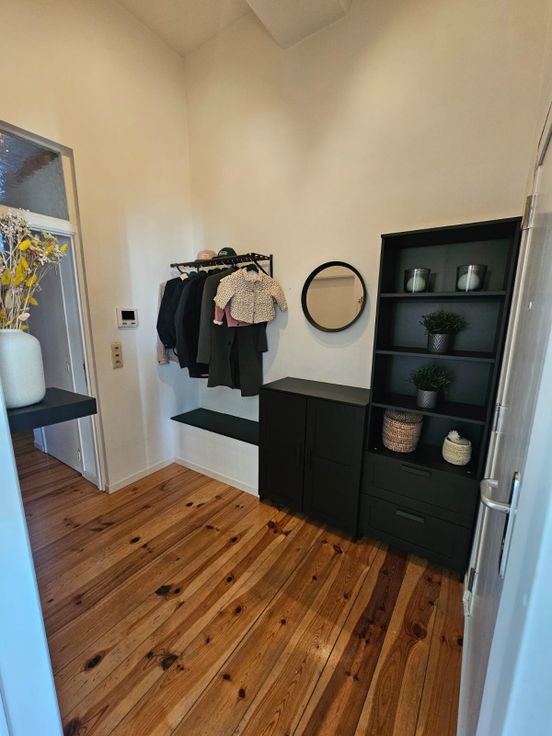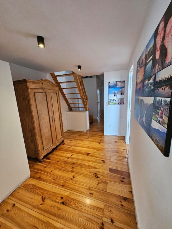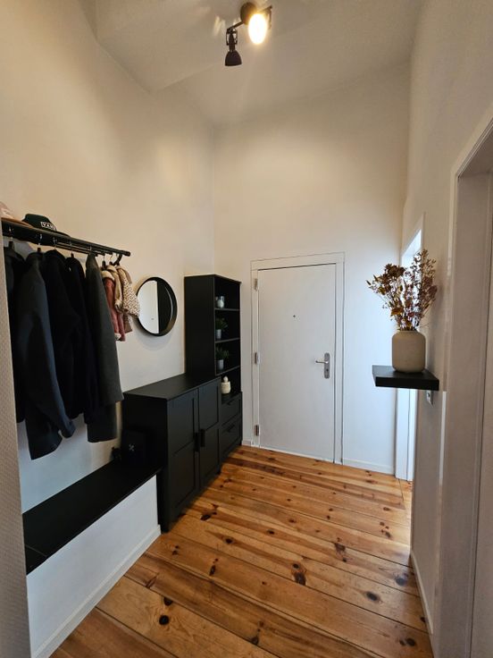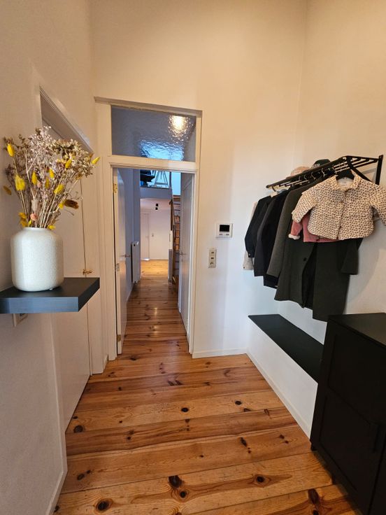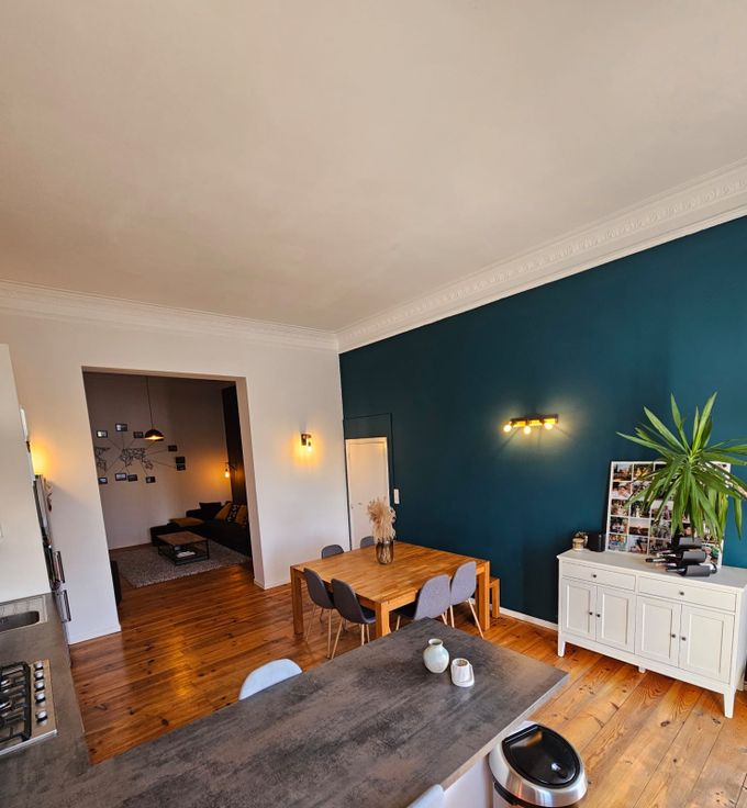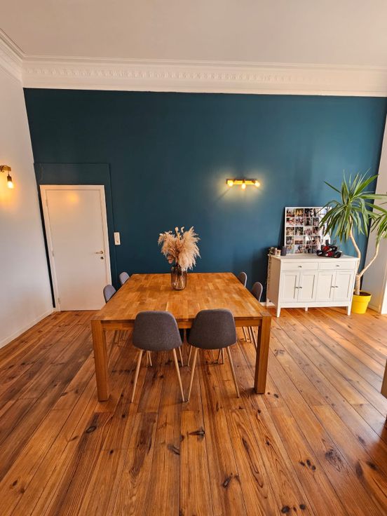 Le parquet en bois massif (remis à neuf en 2019) confère une atmosphère chaleureuse à l’ensemble de l’appartement (hors salle de bain).