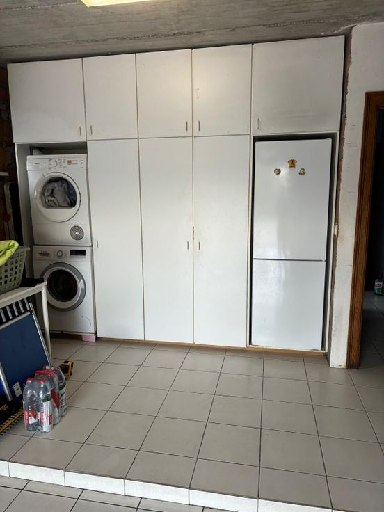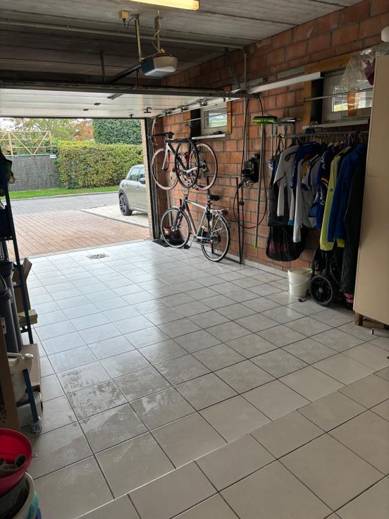 Ruime garage met ingemaakte kasten en laadpaal voor electrische wagen.