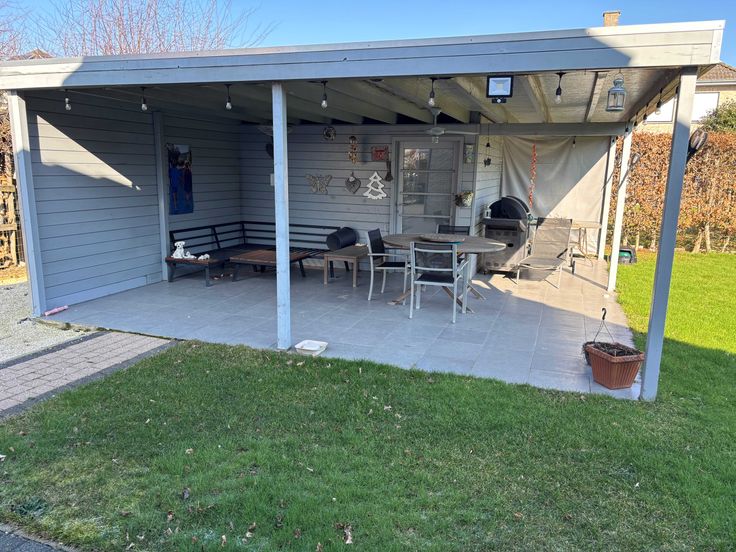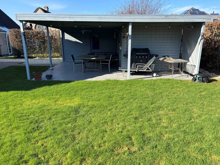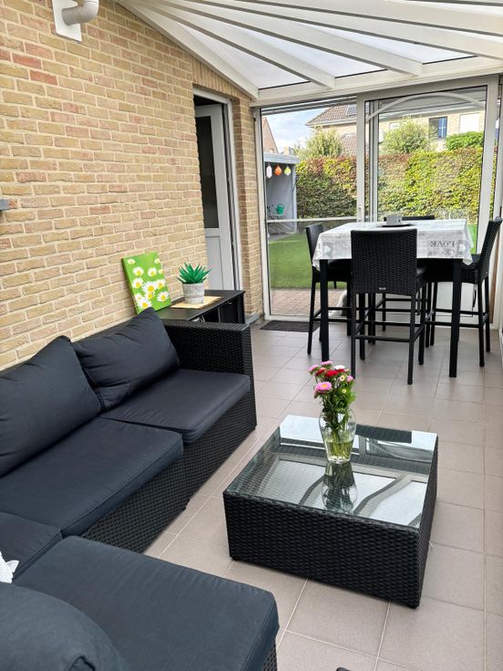 De tuin is volledig afgesloten met omheining. Tuinhuis met ingebouwde lounge en terras.