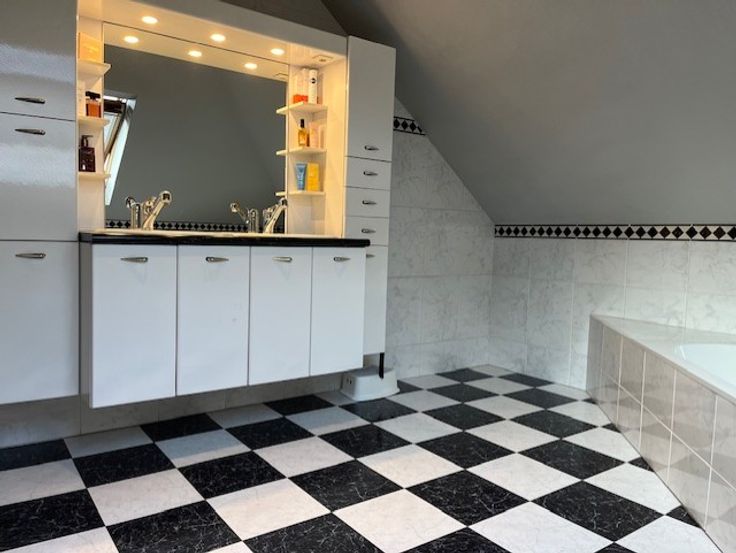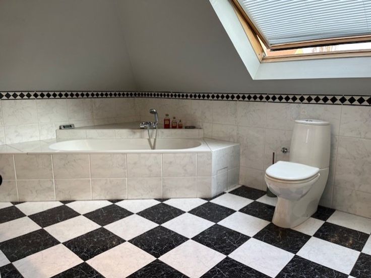 De badkamer is een zeer ruime badkamer, voorzien van bad-douche-toilet.