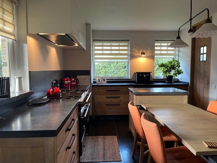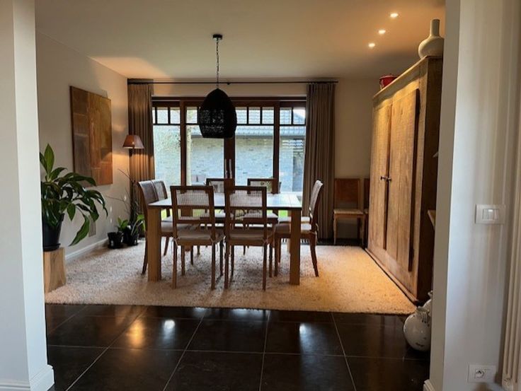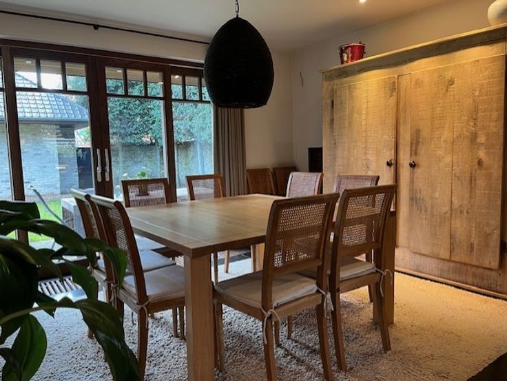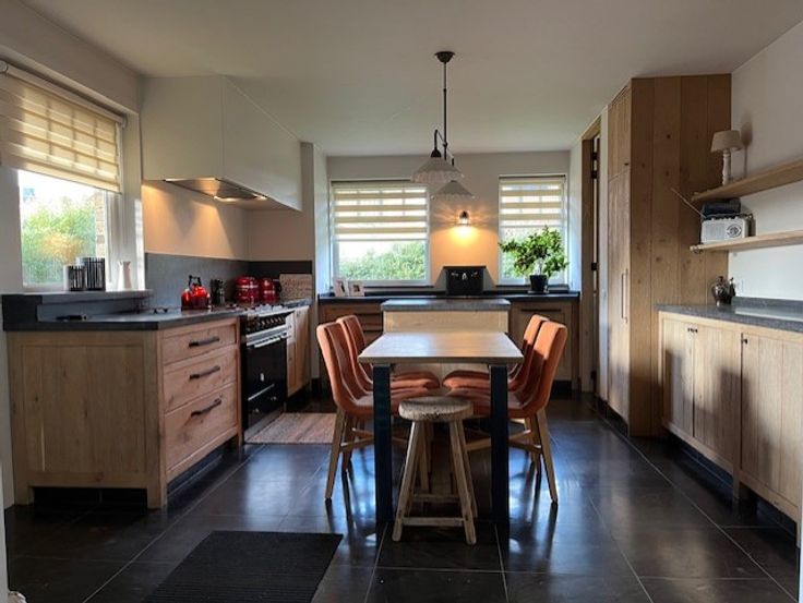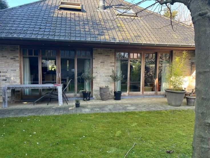 De keuken is zeer kwalitatief uitgerust met duurzame materialen en beschikt over een Lacanche fornuis. De eetplaats en zitruimte bevinden zich aan de binnentuin waardoor het er altijd fijn vertoeven is. Er is een zeer gezellige zitruimte, voorzien van een gashaard en inbouwkasten.