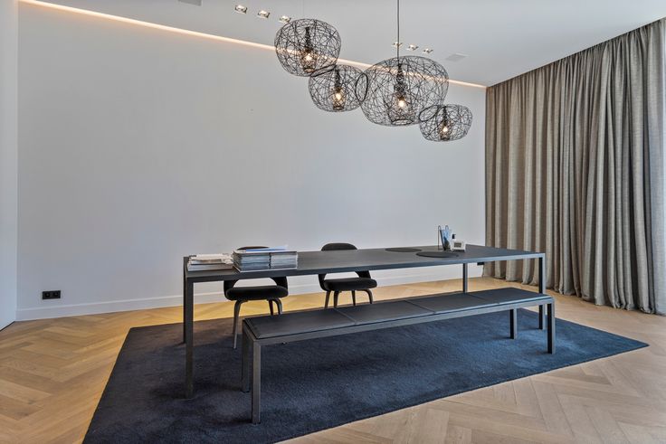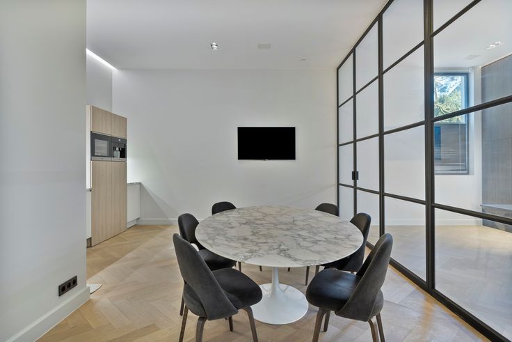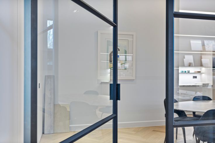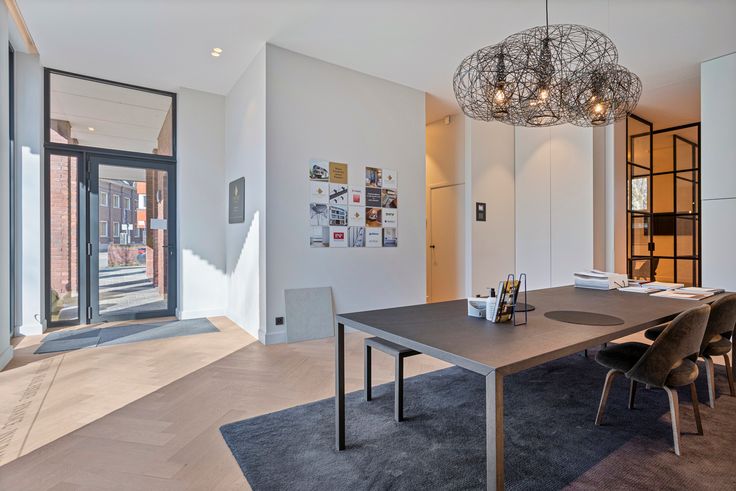 Een op maat gemaakte inbouwkast met schuifdeur scheidt de tweede ruimte, die flexibel inzetbaar is als vergader-, kantoor- of winkelruimte. Hier zorgen smeedijzeren pivotdeuren voor een elegante afsluiting en is een kitchenette discreet ingewerkt.