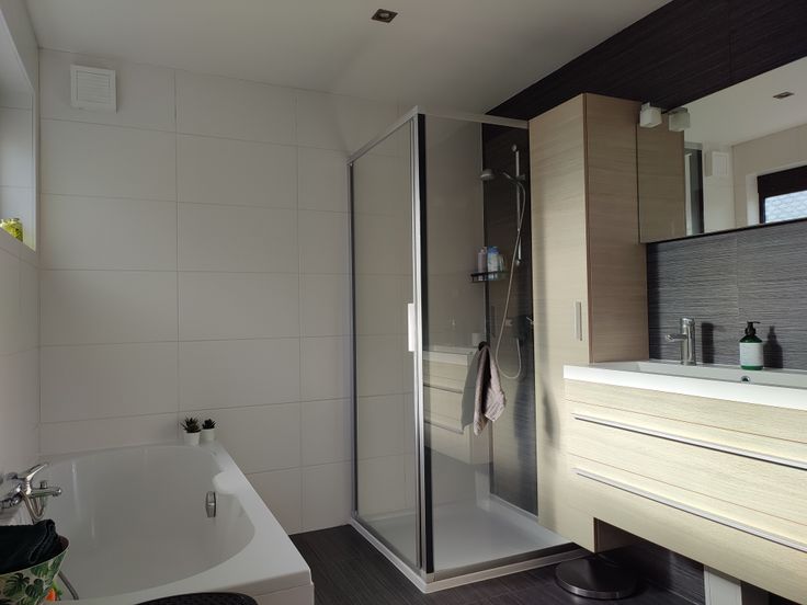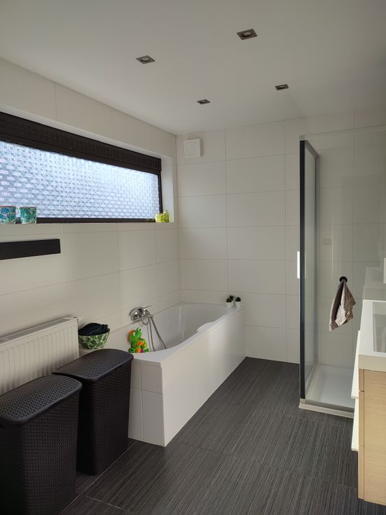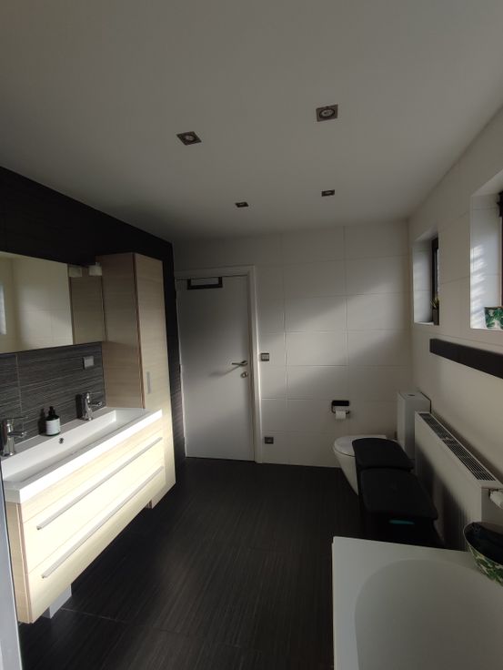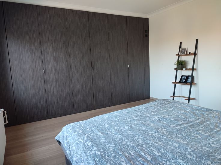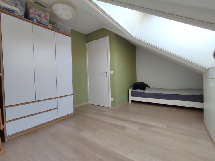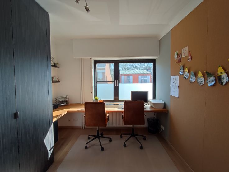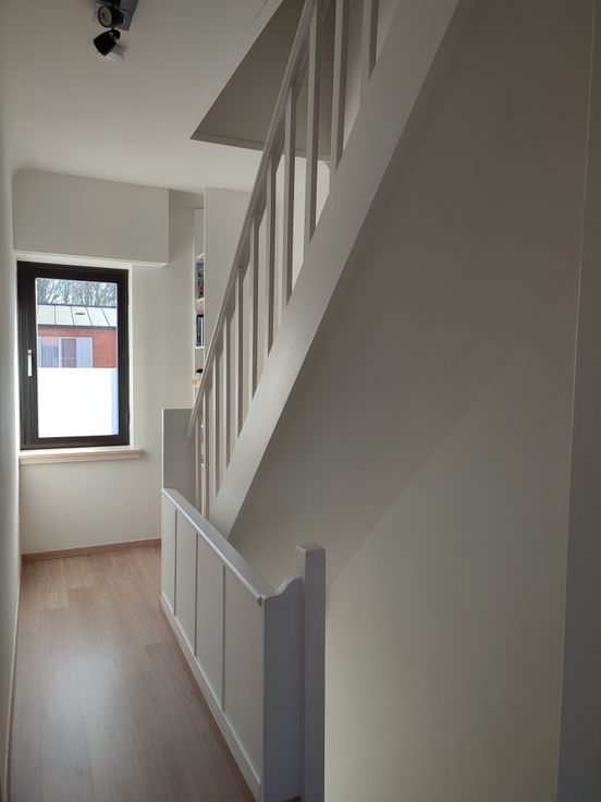 Op de eerste verdieping vinden we de master bedroom en een grote bureau (die kan eveneens dienen als slaapkamer) terug. Beiden zijn voorzien van ruime ingemaakte kasten. Bergruimte is dus alom aanwezig.