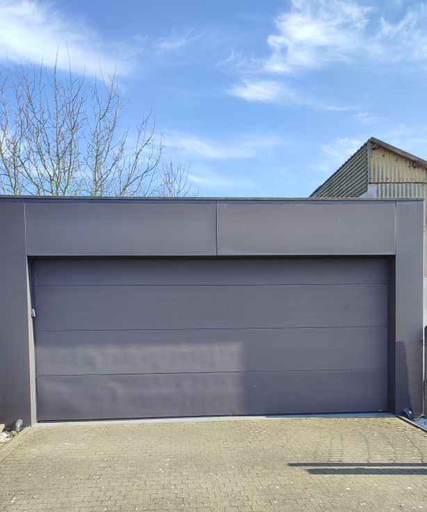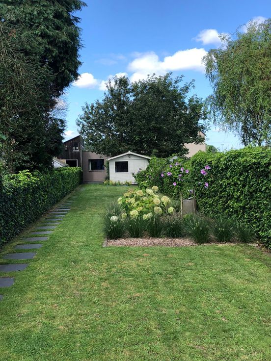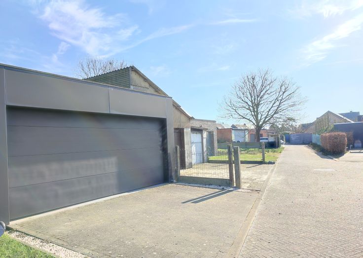 De grote zuidwest gerichte tuin geeft uit op een dubbele garage, voorzien van een sectionaalpoort en een pomp met putwater. De ingang van deze garage is te bereiken via een doodlopende straat in de achterliggende wijk.