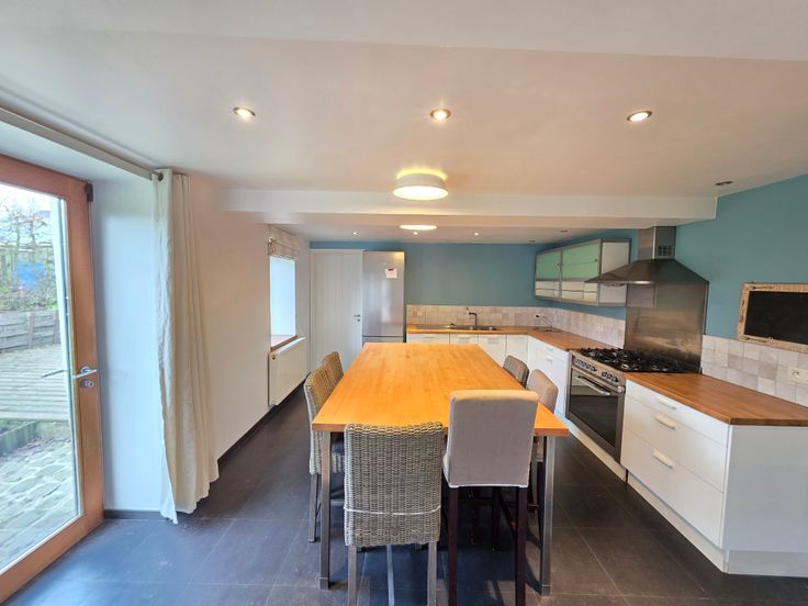 Une lumineuse salle à manger, un salon avec poêle à bois.