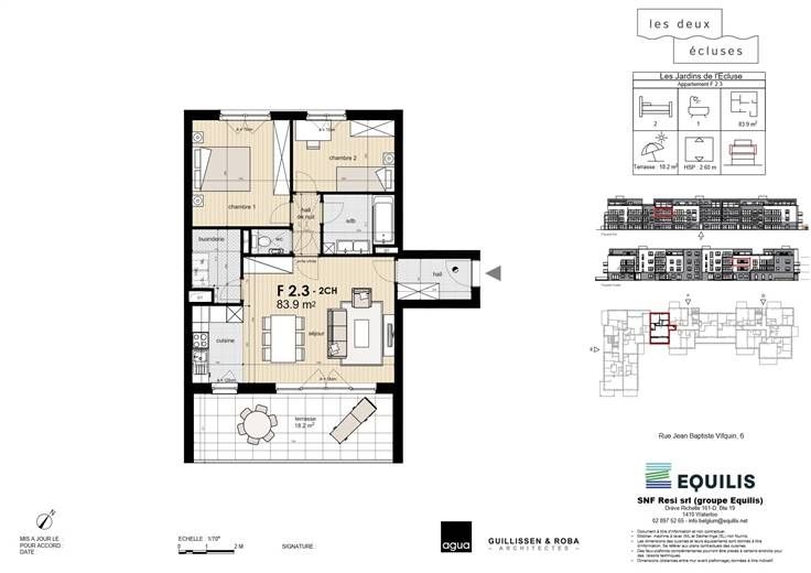 Ontdek dit appartement (ref F.2.3 ) in zijn idyllische omgeving aan de poort van Waals-Brabant (5' van Nijvel) en op een boogscheut van 5 grote wegen. De urbanisatie Les Deux Ecluses heeft het allemaal: gelegen in een groene oase tussen het kanaal en de wandelpaden, op loopafstand van winkels en vervoersverbindingen. Dit lichte appartement met 2 slaapkamers is een uitstekende investering en heeft ook een groot terras van 18,7 m². Alle voorzieningen (keuken, elektriciteit, badkamers, tegels en parketvloer) zijn in de prijs inbegrepen, behalve het schilderwerk. Uitstekende isolatie, liften, maximaal 3 verdiepingen, parkeerkelder en kelders (tegen betaling). Contacteer ons voor meer informatie Les Viviers new@lesviviers.be of 010 24 2
