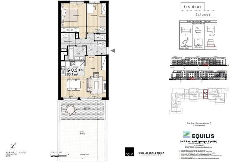 Ontdek dit appartement (ref G.0.5 ) in zijn idyllische omgeving aan de poort van Waals-Brabant (5' van Nijvel) en op een boogscheut van 5 grote wegen. De urbanisatie Les Deux Ecluses heeft het allemaal: gelegen in een groene oase tussen het kanaal en de wandelpaden, op loopafstand van winkels en vervoersverbindingen. Dit lichte appartement met 2 slaapkamers is een uitstekende investering en beschikt over een groot terras van 13,7 m² en een tuin van 29,1 m². Alle voorzieningen (keuken, elektriciteit, badkamers, tegels en parketvloer) zijn in de prijs inbegrepen, behalve het schilderwerk. Uitstekende isolatie, liften, maximaal 3 verdiepingen, parkeerkelder en kelders (tegen betaling). Neem contact met ons op voor meer informatie Les Viviers new@lesviviers.be of 010 24 24 22