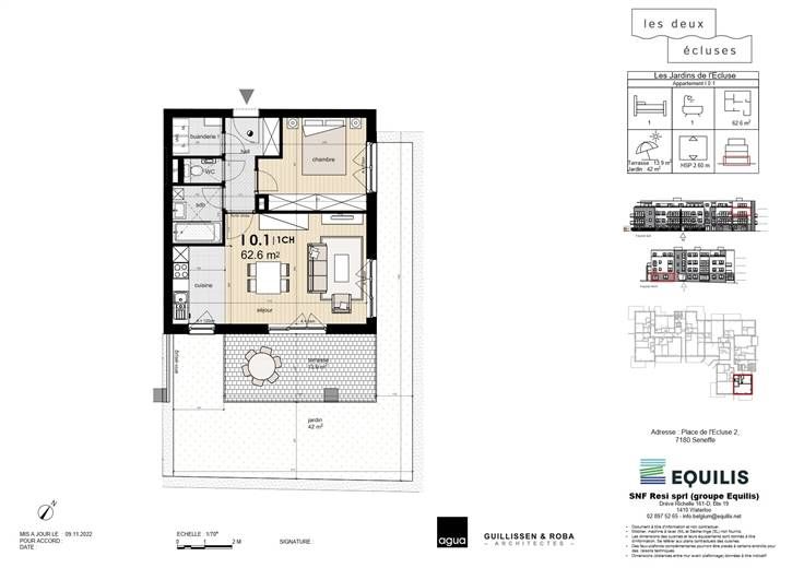 Ontdek dit appartement (ref I.01 ) in zijn idyllische omgeving aan de poort van Waals-Brabant (5' van Nijvel) en op een boogscheut van 5 grote wegen. De urbanisatie Les Deux Ecluses heeft het allemaal: gelegen in een groene oase tussen het kanaal en de wandelpaden, op loopafstand van winkels en vervoersverbindingen. Dit lichte appartement met 2 slaapkamers is een uitstekende investering en heeft ook een groot terras van 15,9 m². Alle voorzieningen (keuken, elektriciteit, badkamers, tegels en parketvloer) zijn in de prijs inbegrepen, behalve het schilderwerk. Uitstekende isolatie, liften, maximaal 3 verdiepingen, parkeerkelder en kelders (tegen betaling). Contacteer ons voor meer informatie Les Viviers new@lesviviers.be of 010 24 2