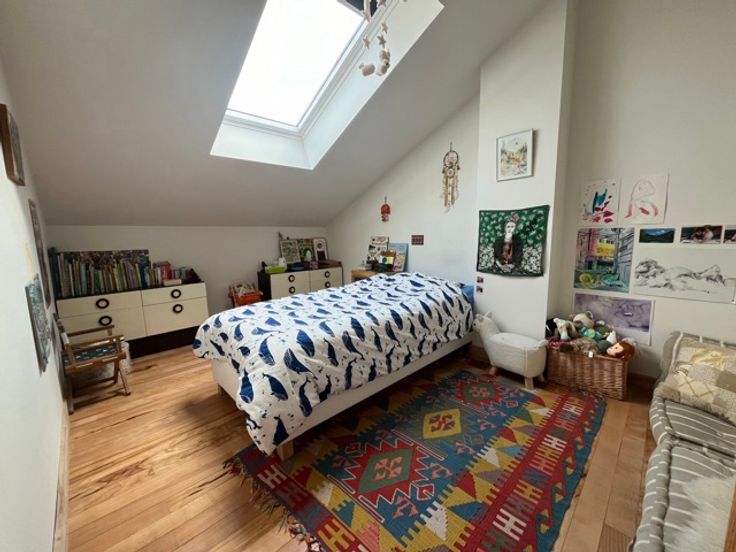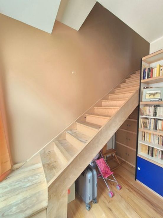 - 2ème étage : hall d'entrée, vestiaire et wc , vaste séjour 3 façades très lumineux avec fenêtres sur chacune d'elle (salon, salle à manger,) cuisine ouverte super-équipée donnant sur une plateforme (permis de terrasse possible) de 10 m², escalier sur mesure pour accéder à l'étage.