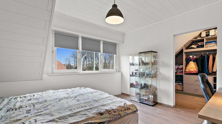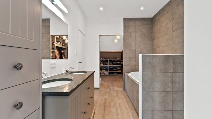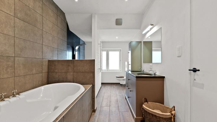 Eerste verdieping: Drie ruime slaapkamers (25m², 15m², 12m²), master bedroom met inloopdressing en een vernieuwde badkamer met bad en douche.