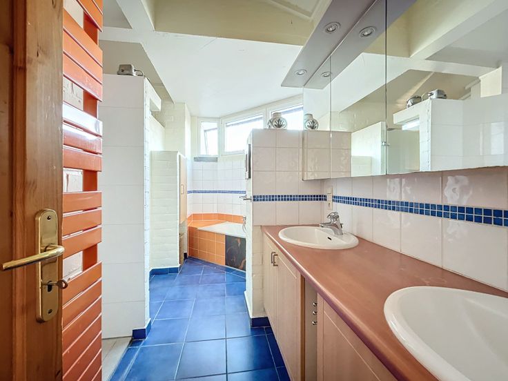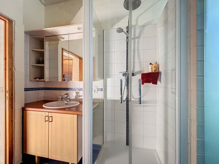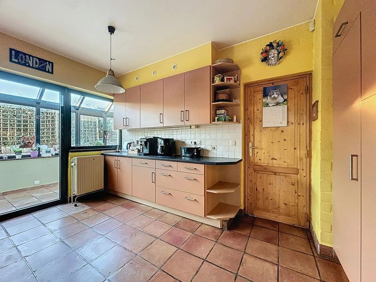 Au rez-de-chaussée, le hall d'entrée avec espace vestiaire, toilettes visiteurs et lave-mains vous conduit vers le spacieux salon, la salle à manger et la cuisine entièrement équipée. Une grande véranda, communicante avec la cuisine et la salle à manger, ajoute un bel espace de vie. Le garage a été aménagé en espace de rangement avec adoucisseur d'eau et communique directement avec la buanderie.