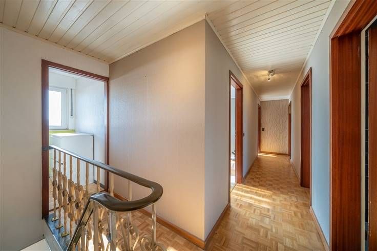 Eerste verdieping (84m2): traphall (1m70x2m95), opbergruimte of dressing (1m70x1m60), nachthall (1m00x5m40), slaapkamer1 (4m15x3m55), slaapkamer 2 (3m55x3m90), slaapkamer 3 (2m60x3m50) + (1m40x1m15), slaapkamer 4 (2m55x3m90) met de trap naar de zolderverdieping, badkamer (2m25x3m90) met ligbad/douche, meubel met wastafel en hang-WC