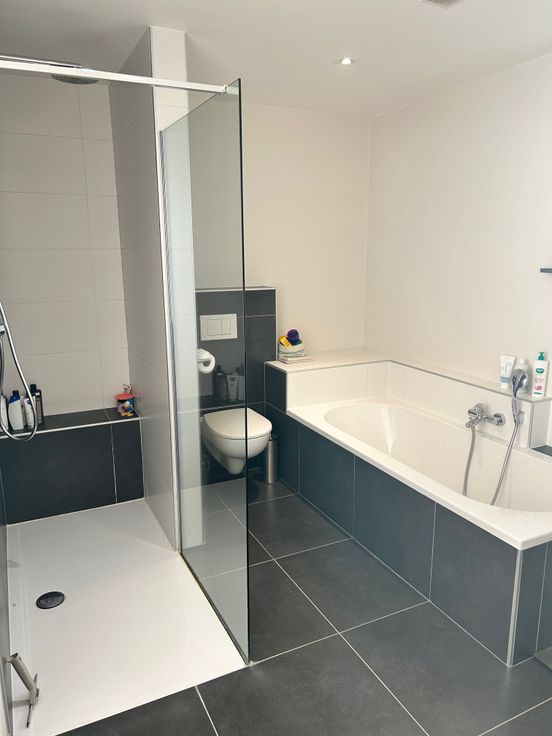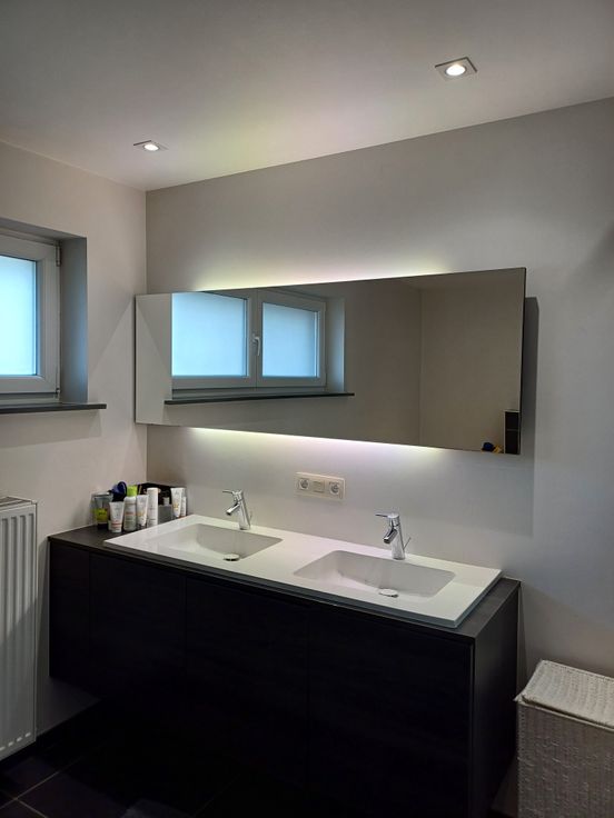 • Stijlvolle badkamer met inloopdouche, ligbad, dubbele lavabo, grote spiegel met indirecte verlichting en toilet