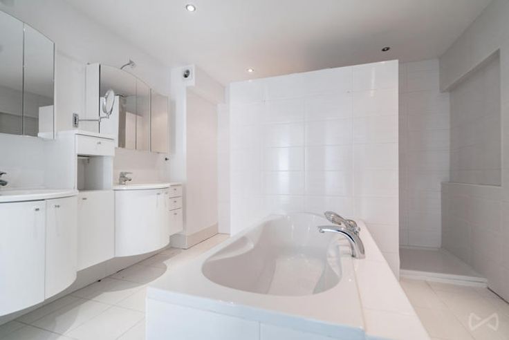 • Salle de bain élégante avec baignoire, douche, double vasque et WC