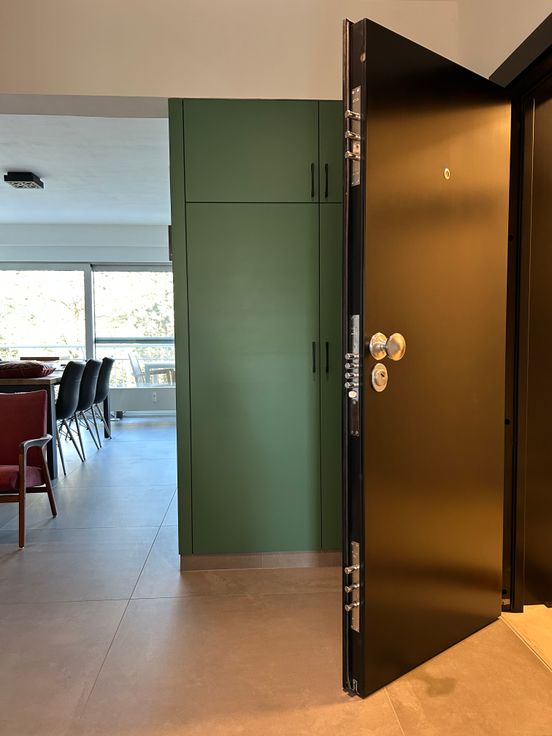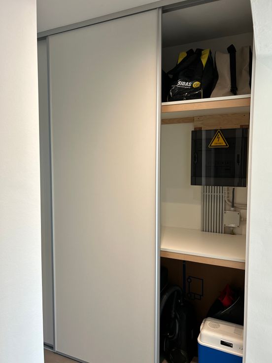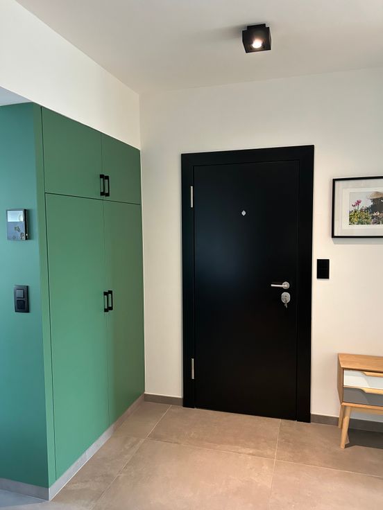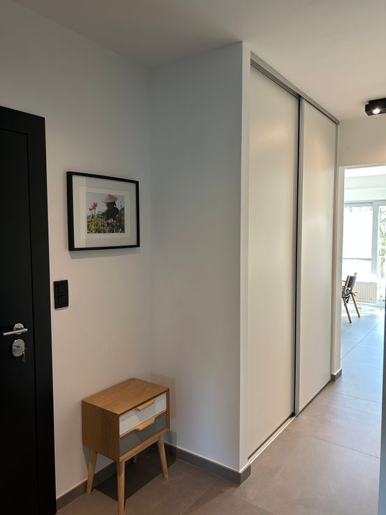 Inkom via brandwerende/gepantserde deur, met ruime vestiairekast 120cm.