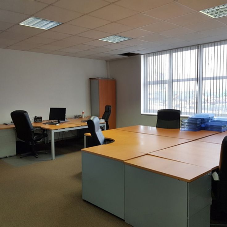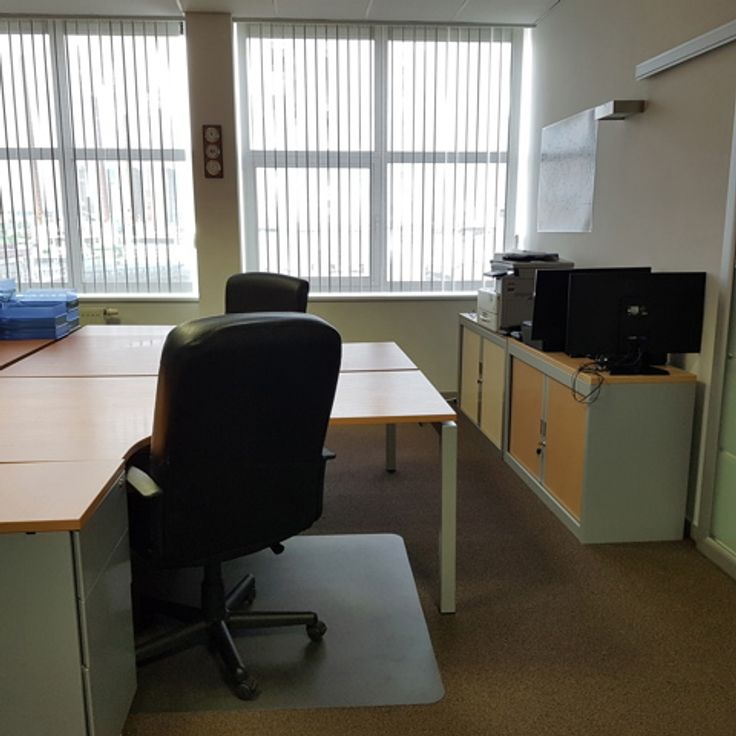 Op de eerste verdieping vinden we een mooie kantoorruimte van 90 m², opgedeeld in een kantooreiland ruimte en een ingerichte vergaderzaal annex directiekantoor.