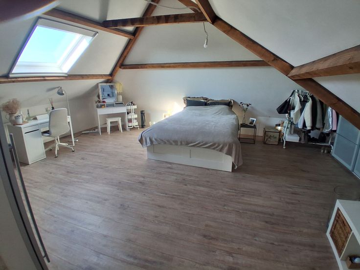 De tweede verdieping is verdeeld in een grote slaapkamer met ingebouwde bergruimte/zolder.