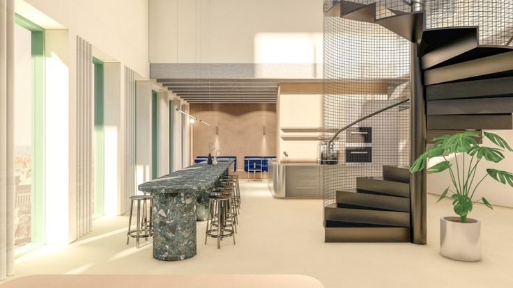 Specificaties: ingedeelde kantoorruimte met gemeenschappelijke keuken en sanitair H/D per verdieping, plafond met betonnen gewelven en open zoldering, opbouw led-armaturen, plafondkabelgoten, databekabeling, geothermische warmtepomp en betonkernactivatie, airco, breedband internet, toegangscontrole met badge Salto KS, 24/7 toegang, mogelijkheid tot publiciteit op totem, binnentuin en rooftopgarden, bovengrondse- en ondergrondse parking