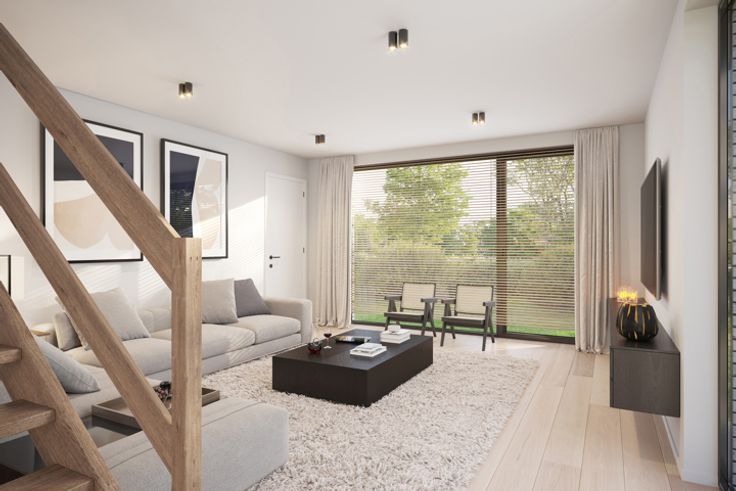 Rez-de-chaussée : hall, WC séparé avec lave-mains, séjour avec cuisine équipée ouverte (7.000 € HTVA), cellier, coin buanderie, garage avec porte sectionnelle motorisée, place de parking, fondation de terrasse prête et jardin non engazonné