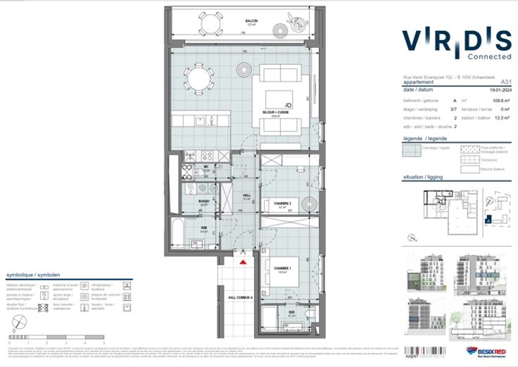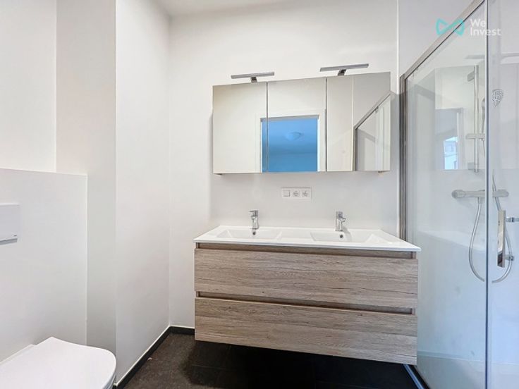 TEL: +32.2.315.51.73 / MAIL: viridis@weinvest.be We Invest stelt met trots het project Viridis voor. Genesteld in het hart van het Mediapark, op gelijke afstand van de Europese wijk en de NAVO, bevindt u zich in de onmiddellijke nabijheid van tal van openbaarvervoersdiensten van de MIVB en De Lijn. U hebt ook gemakkelijk toegang tot de Ring en de snelweg naar Luik. Tot slot bevindt u zich in de buurt van een groot aantal winkels, restaurants en andere voorzieningen (scholen, crèches, enz.). Dit gloednieuwe appartement van 110 m2 ligt in een gebouw met een lift en bestaat uit: een apart toilet, 2 badkamers, een keuken die uitkomt op de woonkamer, 2 slaapkamers en een bijkeuken. Er is ook een aangenaam terras. Technisch gezien is de flat uitgerust met een individuele warmtepomp en vloerverwarming, ramen met dubbele beglazing en een ventilatiesysteem. Naast een kelder is er toegang tot een fietsenkamer. Je kunt ook een parkeerplaats huren (optioneel: €100). In het hart van het project geniet je van een volledig autovrije groene ruimte, in een rustige omgeving weg van de drukte van de stad. PLATTEGRONDEN: https://demo.vision-360.be/besix/ Huur: €1.500/maand Servicekosten: €110/maand (gedeelde servicekosten + onderhoud boiler en VMC) EPB : B Beschikbaar op 01/06/2025! 3-jarig huurcontract! Voor meer woningen in dit project en andere exclusieve aanbiedingen, bezoek www.weinvest.be!