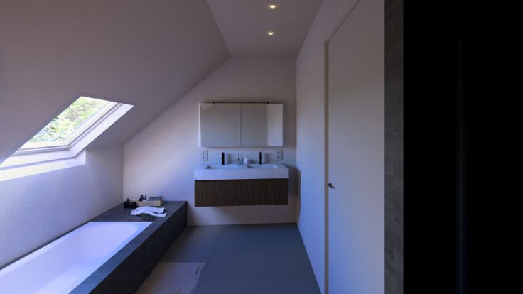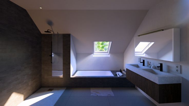 Sanitair via Van Marcke (wijzigingen mogelijk) : (2 hangwc + 1 handwasbakje + kraanwerk chroom + 1 meubel + 2 inbouwwastafels + spiegel + kraanwerk 1-greeps + 1 douche 150x90 + kraanwerk thermostatisch + 1 vaste glazen wand 100)