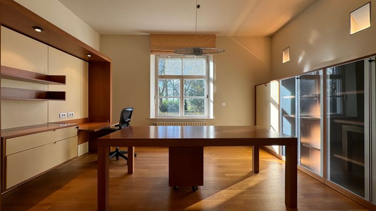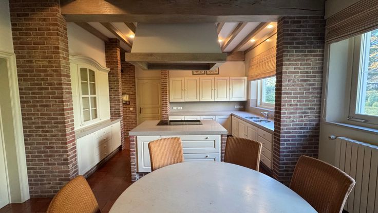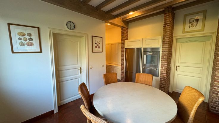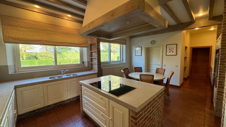 Hoofdgebouw: De royale inkomhal, voorzien van gastentoilet, biedt langs de rechterzijde toegang tot een formele zithoek met houthaard. Aansluitend komen we terecht in de leefruimte met eet-en zithoek. Verder is er ook nog de keuken die volledig werd uitgerust met koelkast en vriezer, oven met bordenwarmer, kookeiland (5 vuren, inductie) en een dubbel spoelbekken. In de keuken is er voldoende plaats voor een eethoek. Aansluitend is ook een berging voorzien. De bijkeuken werd uitgerust met een extra koelkast en een wijnklimaatkast, een vaatwasmachine, dubbel spoelbekken en voldoende inbouwkasten. Aan de linkerzijde van de inkomhal vinden we een volledig ingerichte bureelruimte terug, alsook nog een extra zit - of ontspanningsruimte.
