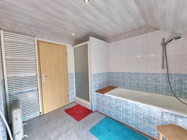 Au rdc: hall d'entrée, wc, une chambre, de beaux volumes pour le séjour/salle à manger avec poêle à pellet, cuisine équipée (avec poêle à bois) donnant accès à la véranda, une arrière cuisine avec coin douche.