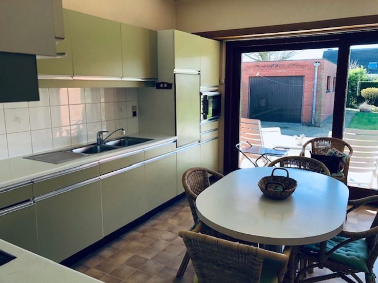 Achter woonkamer bevindt zich de keuken van 17m’ met grote schuifraam die uitgeeft op het terras en tuin