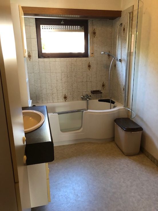 De badkamer heeft een instapbad/douche, wastafel en toilet