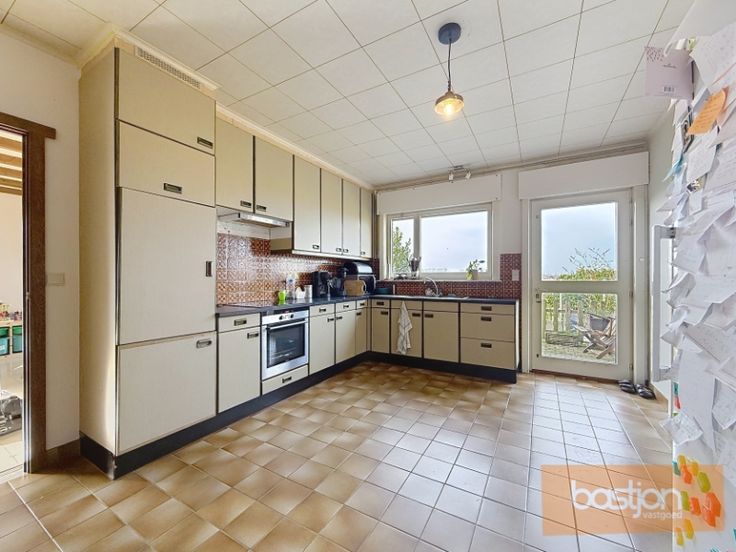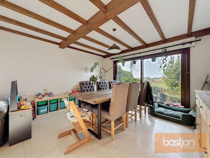 Vanuit zowel de leefruimte als de keuken geniet je van een adembenemend uitzicht op de omliggende velden, een perfecte plek om te ontspannen en tot rust te komen.