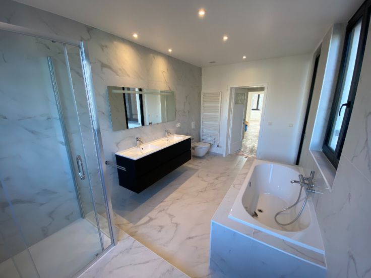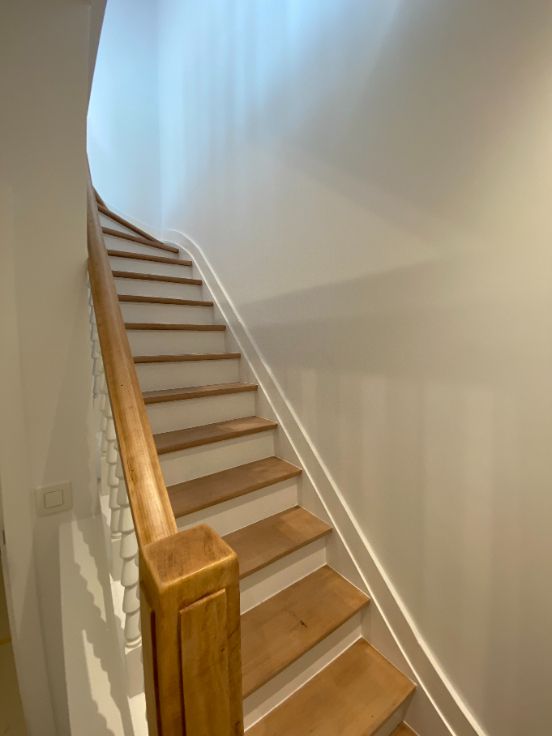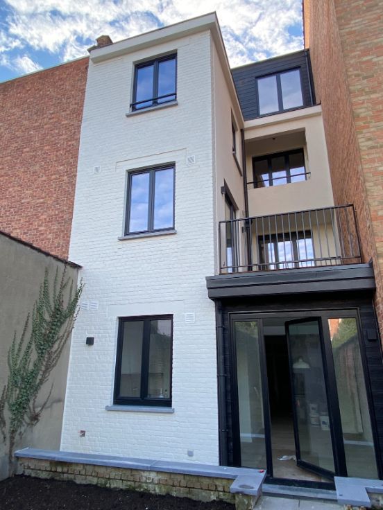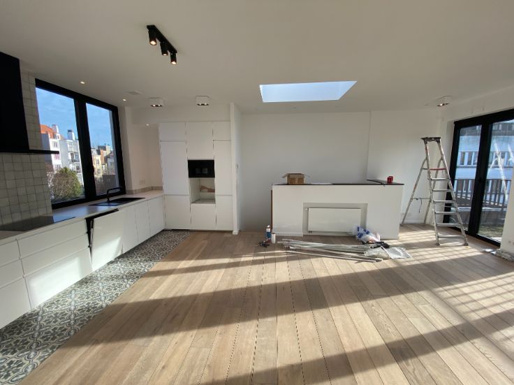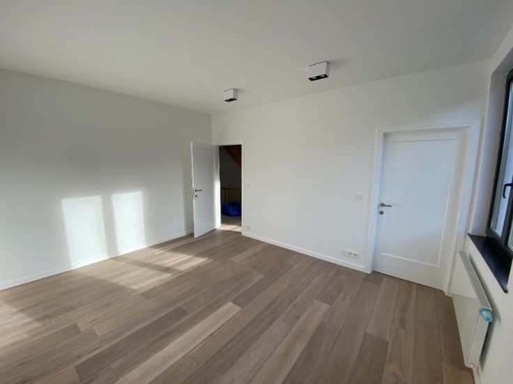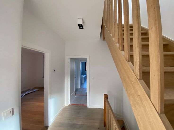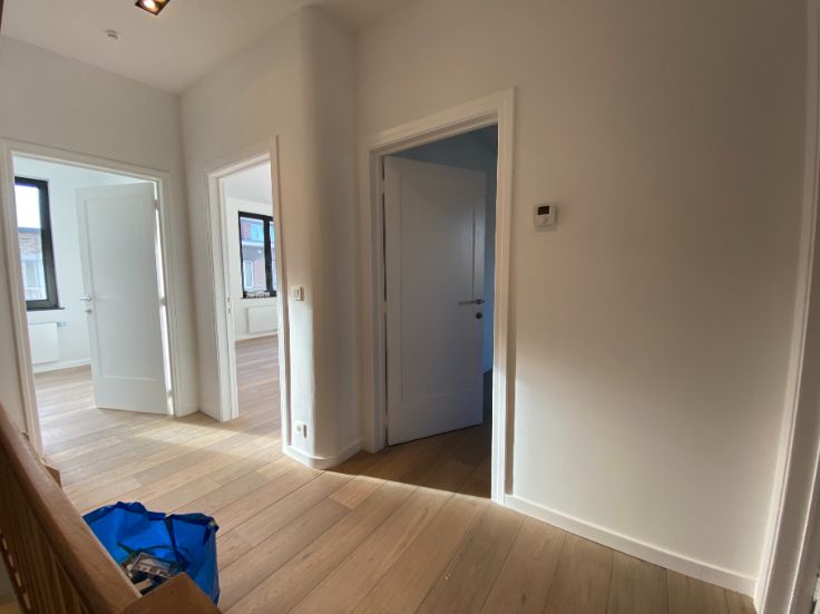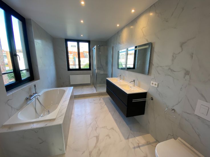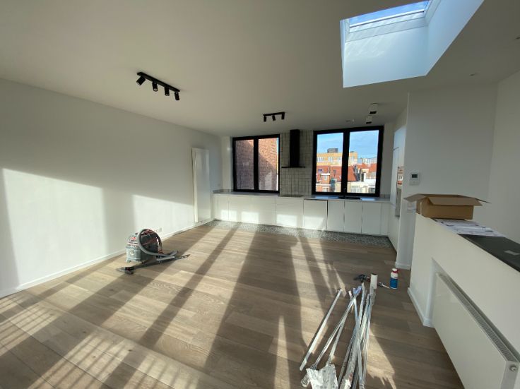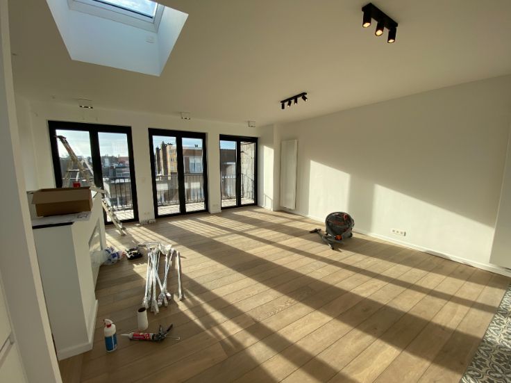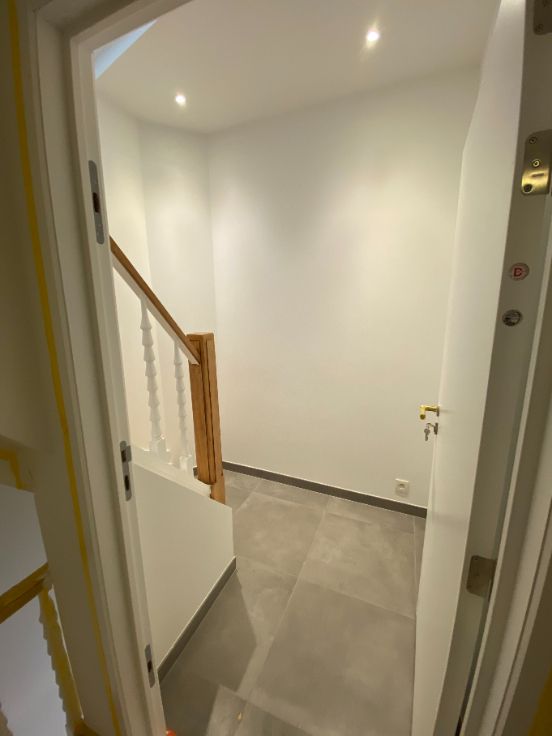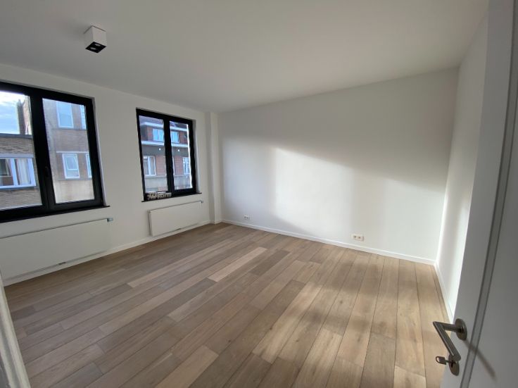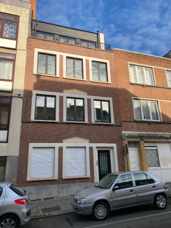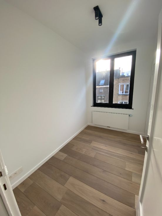 A louer Uccle rue vanderkindere : superbe duplex de 110 m2 entièrement rénové avec matériaux de qualité (première habitation) et avec goût, grande terrasse plein sud, 3 chambres, grand salon salle à manger, salle de bain (douche et baignoir), cuisine, hall de nuit, deux grandes caves fermées :