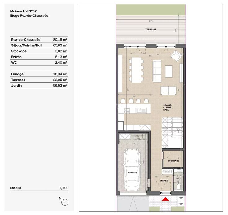 Au rez-de-chaussée, elle se compose d'un hall d'entrée (8,13m2), d'un débarras (3,82m2), WC séparé (2,40m2), spacieux séjour (65,83 m2) avec cuisine équipée ouverte donnant accès à une terrasse de 22,05m2 et son jardin verdoyant, garage (18,34m2) pour 1 voiture et stationnement extérieur devant le garage.