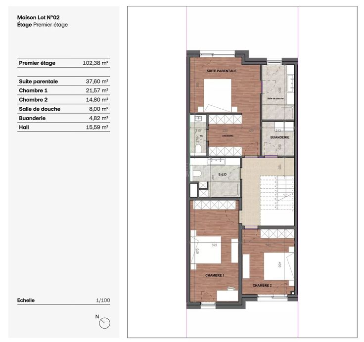 Au 1er étage elle ce compose d'un hall de nuit (15,59m2), chambre (21,57m2), chambre (14,80m2), salle de douche (8m2), buanderie (4,82m2), suite parentale (37,60m2 )comprenant un espace dressing, une salle de bain et un WC séparé