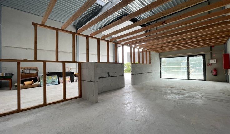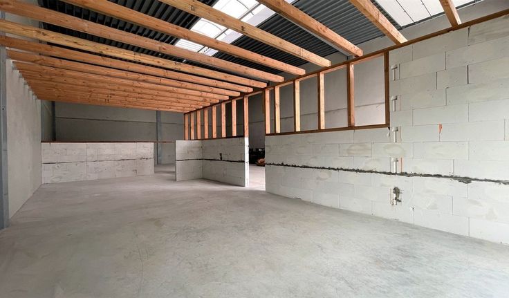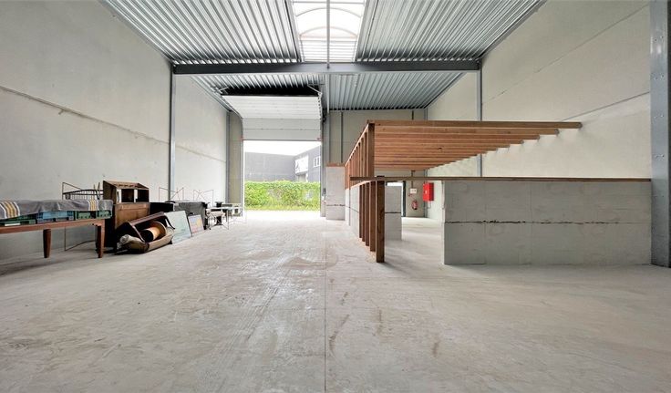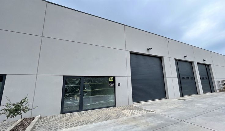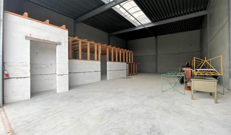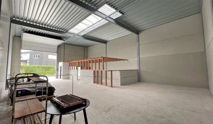 Specificaties: gevel in architectonisch beton, staalstructuur, vrije hoogte: 6m, 1 automatische sectionaalpoort 4,6m (b) x 4,5m (h), geïsoleerd steeldeck dak met centrale lichtstraat, ledarmaturen, polybetonvloer, brandalarm, brandblusapparaten en brandblushaspels, rookluiken, elektriciteit