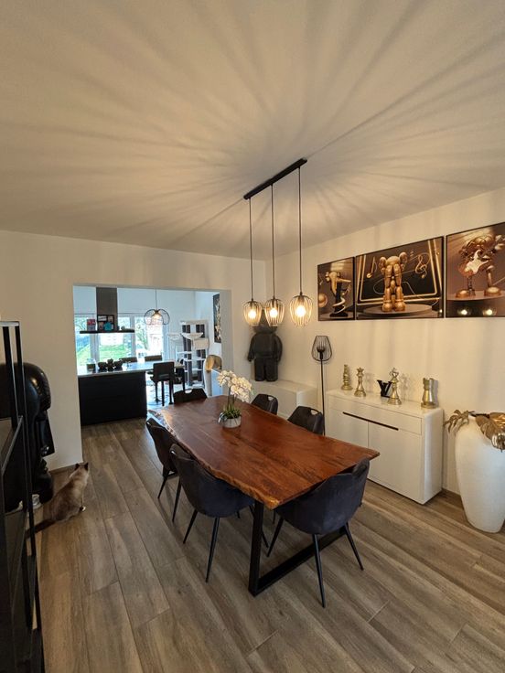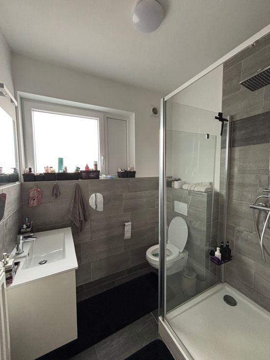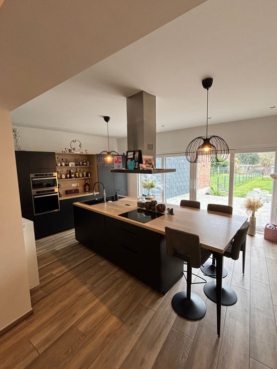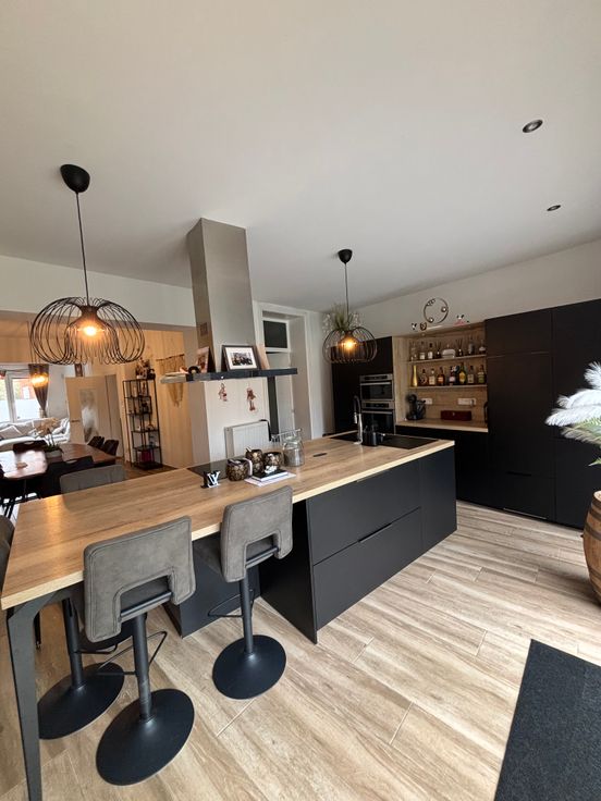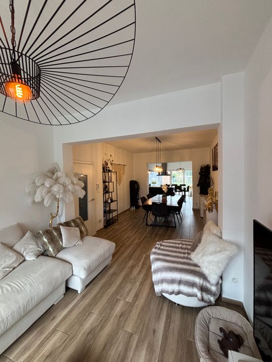Au RDC : Hall d’entrée, wc séparé avec lave-mains, spacieux et lumineux living de +- 60 m2 avec cuisine moderne hyper-équipée
