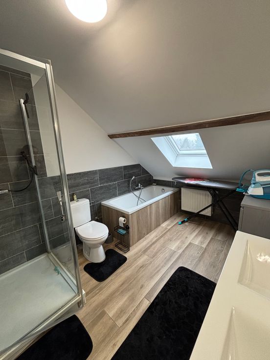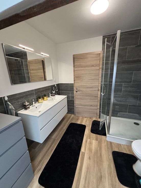 Au 2ème étage : 1 salle de bain ( baignoire, douche, double éviers, wc), 2 chambres ( 18m2, 15m2 ).