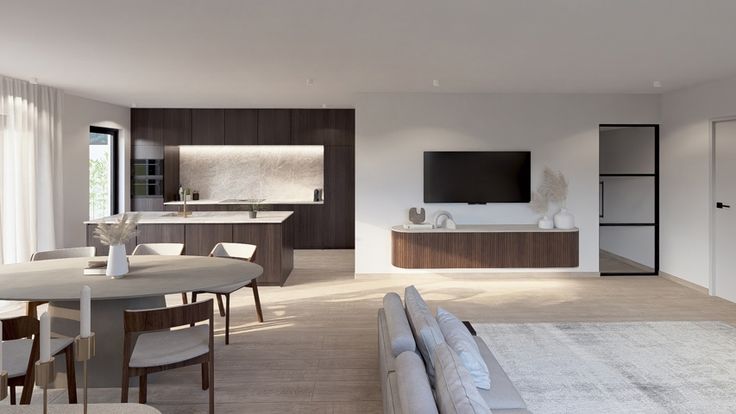 Op het gelijkvloers bevinden zich de inkomhal met gastentoilet, de lichtrijke leefruimte met open keuken en een berging met aansluiting voor een wasmachine.