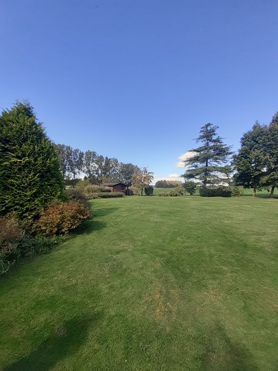 Environnement champêtre et bucolique. Jardin paysagé offrant à l'arrière une vue dégagée sur les champs et la campagne environnante.