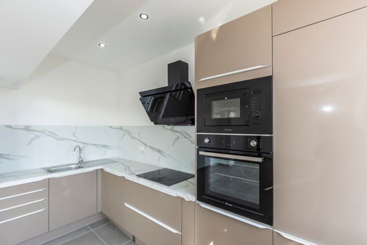 Composition : une buanderie se situe au RDC, puis, à l’étage, un grand hall dessert 2 belles chambres, une salle de douche élégante (avec douche à l’italienne, WC, meuble lavabo simple, sèche-serviette et extracteur), ainsi qu’un spacieux et lumineux séjour avec une cuisine ouverte entièrement neuve et équipée (évier INOX, lave-vaisselle, taque vitrocéramique, hotte design, four, four à micro-ondes, réfrigérateur et congélateur).