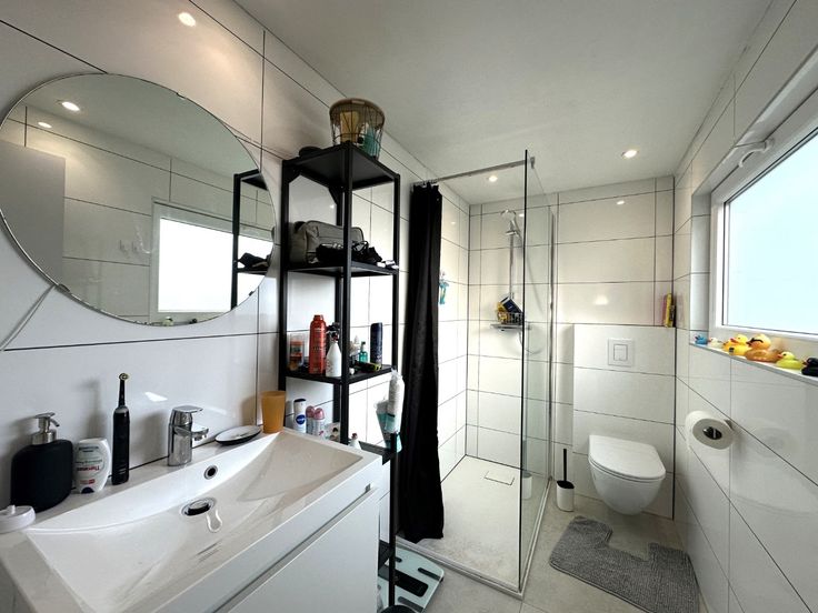 - Moderne badkamer voorzien van enkele wastafel, inloopdouche en toilet
