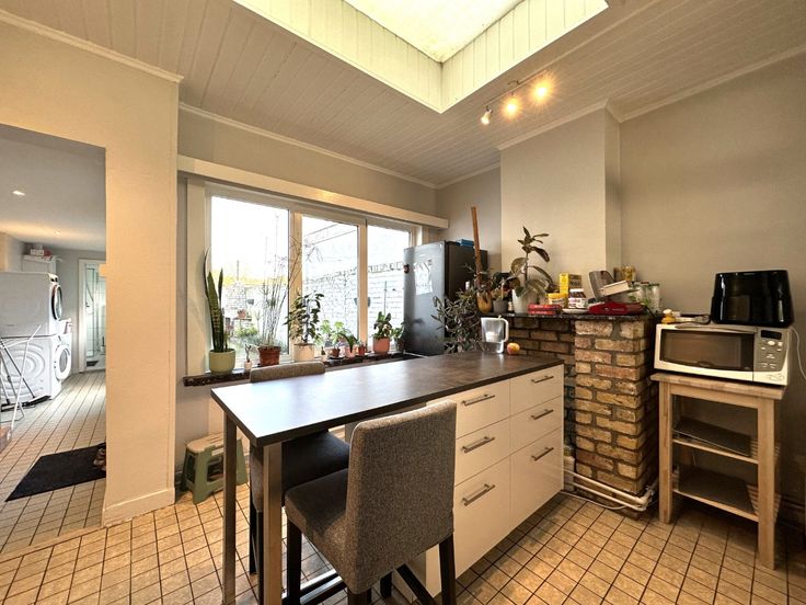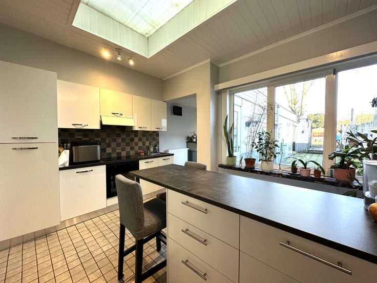 - Keuken voorzien van koelkast met vriesvak, vaatwasmachine, inductiekookplaat, en oven. Er is een eiland voorzien waar aan gegeten kan worden en die extra opbergruimte biedt.