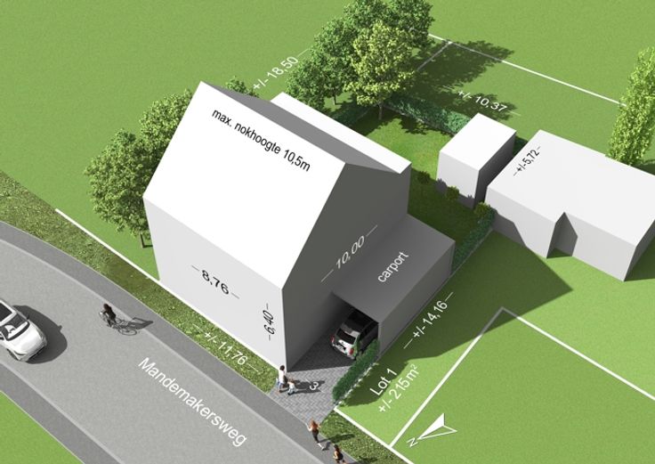 Lot 1 is gelegen langs de Mandemakersweg en heeft een oppervlakte van ca. 215 m² voor een woning halfopen bebouwing.