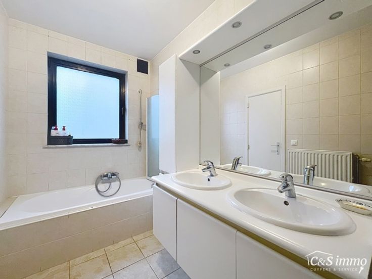 Licht en ruim hoekappartement met 2 slaapkamers en een zonnig terras op de eerste verdieping. De woon- en eetkamer (ca. 35 m²) is voorzien van een stijlvolle laminaatvloer en sluit naadloos aan op de open keuken met tegelvloer, uitgerust met een kookplaat, dampkap en koelkast. Beide slaapkamers (ca. 12 en 10 m²) zijn afgewerkt met laminaat. De ruime, ingerichte badkamer heeft een tegelvloer en beschikt over een ligbad met douchemogelijkheid, een dubbel badkamermeubel met lavabo en spiegel. Via de badkamer is er toegang tot een berging (ca. 4 m²) met cv-ketel en aansluiting voor wasmachine en droogkast. De inkomhal biedt extra comfort met een vestiaire en een apart toilet met handenwasser. Een grote raampartij in de woonkamer leidt naar het zonnige terras (ca. 8 m²). Achteraan is er een mogelijkheid tot aankoop van een afgesloten garagebox. Het appartement maakt deel uit van een kleinschalig gebouw met lage gemeenschappelijke kosten. Elektriciteit is conform. Ideale ligging nabij winkels en belangrijke verbindingswegen.