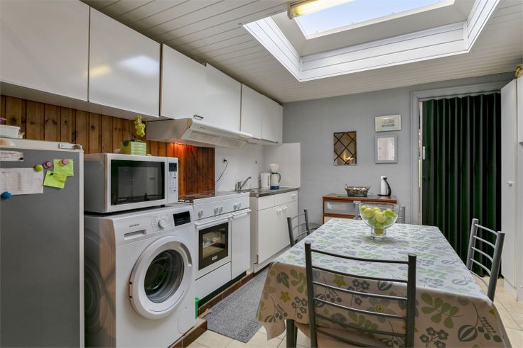 Bij binnenkomst betreedt u een gezellige leefruimte, die aansluit op de eetkamer en de keuken met een lichtkoepel. Achter de keuken bevindt zich links de badkamer, voorzien van een douchecel, toilet en lavabo. Verder in de gang vindt u een ruime berging, die uitgeeft op een klein terrasje en een diepe tuin met zicht op aanpalende velden. Een ruim tuinhuis biedt extra opbergruimte.