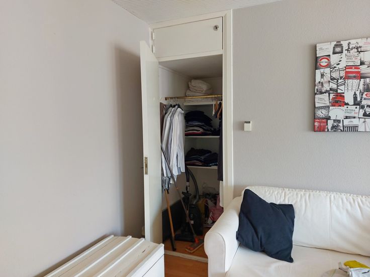 Brede living met grote berging dat dienst doet als dressingkast, de eettafel is plaatsbesparend met de inschuifbare stoelen.