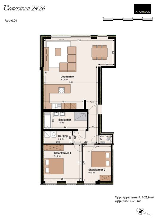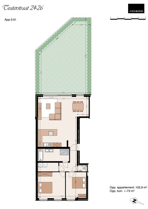 Ontdek het kleinschalig nieuwbouwproject “Theater” bestaande uit 6 appartementen, garageboxen en een bijzonder ruime gemeenschappelijke tuin. Gelegen in een rustige woonstraat met vooral plaatselijk verkeer. Op minder dan 5min stappen van Merelbeke station. Op wandelafstand van diverse kleinhandel, alle voorzieningen en strategisch goed gelegen qua bereikbaarheid. De ontwikkelaar legt de nadruk op Duurzaamheid: bijna energieneutraal (BEN) E-peil 30 maximale isolatie- vloerverwarming met warmtepomp - ALU HR++ ramen -ventilatie-zonnepanelen. Kwalitatieve afwerking: ruime afwerkingsbudgetten en moderne indeling. Comfort: ruime lichtrijke leefruimtes, ruim zuid-west gerichte terrassen, 2 of 3 slaapkamers, privatieve toegang tot de ruime afgewerkte tuin met aparte fietsenberging & afvalberging, garageboxen met stopcontacten voor elektr. laden, … kortom dit project heeft het allemaal. Dit gelijkvloers-appartement beschikt over 2 ruime slaapkamers aan straatkant en een privatieve ZW-gerichte tuin met terras. Een lichtrijke leefruimte met open volledig geïnstalleerde keuken. Er is voldoende budget voorzien voor de keuze van de keuken. Aansluitend is er een ruime badkamer voorzien met ligbad, inloopdouche, dubbele lavabo en een apart toilet. Optioneel is er een ruime garagebox aan te kopen met aansluiting voor elektrisch laden. In deze bouwfase kunnen keuken, badkamer en de volledige afwerking nog gekozen worden volgens de wensen van de koper. Afgewerkt eind 2025. BTW aan 6% mogelijk.