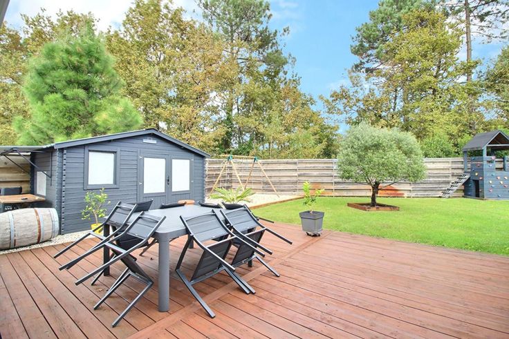 Côté extérieur une allée en enrobé amenant à un grand garage attenant a la maison de 19M² et possibilité de garer plusieurs véhicules, un beau jardin bien aménagé avec une première grande terrasse bois face au salon, une piscine de 8x4m chauffée et sécurisée, une deuxième terrasse face au jardin avec un cabanon de 19M² et une zone de jeu pour enfant et un grand terrain de pétanque.