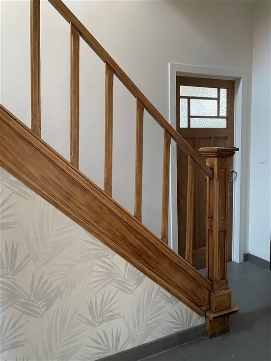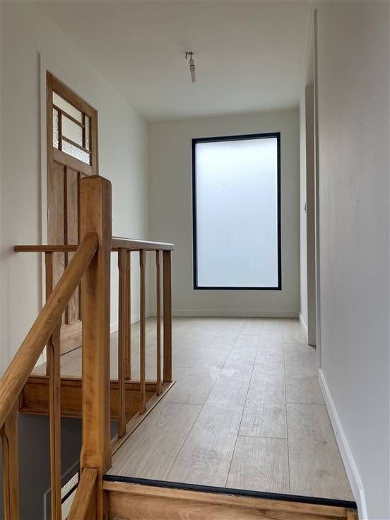 Het huis is als volgt ingedeeld: een gezellige inkomhal, lichtrijke leefruimte en eetruimte met open keuken. De keuken is volledig vernieuwd en ingericht met de nodige toestellen. Langs het schuifraam in de keuken is het zuidelijk georiënteerd terras bereikbaar. Naast de keuken is een open bureauruimte aanwezig. De nieuwe badkamer is uitgerust met een toilet, lavabo en inloopdouche. Verder op het gelijkvloers bevindt zich een wasplaats met aparte berging en keldertje. De authentieke trap brengt u naar de eerste verdieping met maar liefst 5 volwaardige slaapkamers.