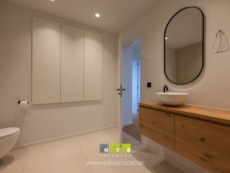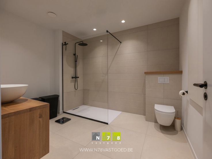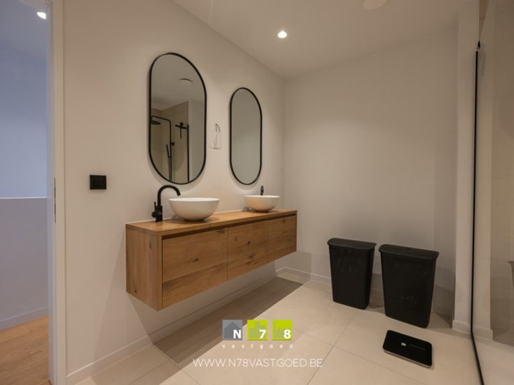- Badkamer (3,12m x 3,53m = 11,01m²): badkamermeubel (dubbele lavabo, onderkast), aparte douche, toilet, tegelvloer.